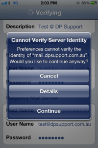 10. You will see a new screen appear with the message “Cannot Verify Server Identity”. You can safely ignore this message by clicking on the Continue button.